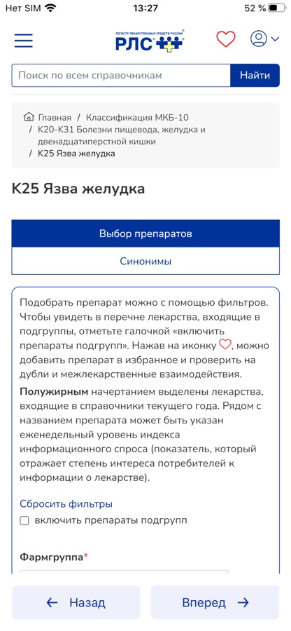 • подобрать препараты по заболеванию (МКБ-10), группе АТХ и фармгруппе;