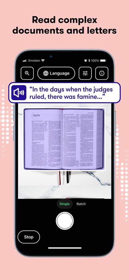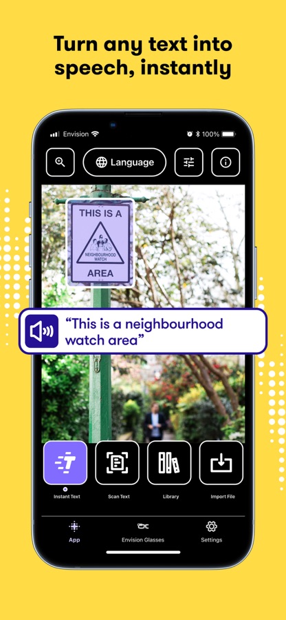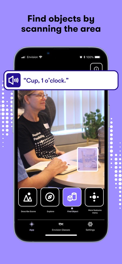 Просто используйте камеру своего телефона для сканирования текста, окружения, объектов, людей или товаров и все будет зачитано Вам благодаря умному искусственному интеллекту и технологии OCR от Envision.