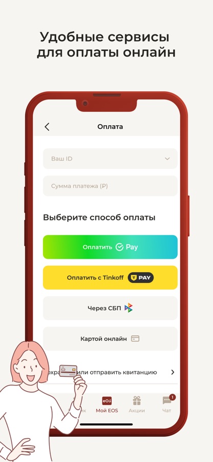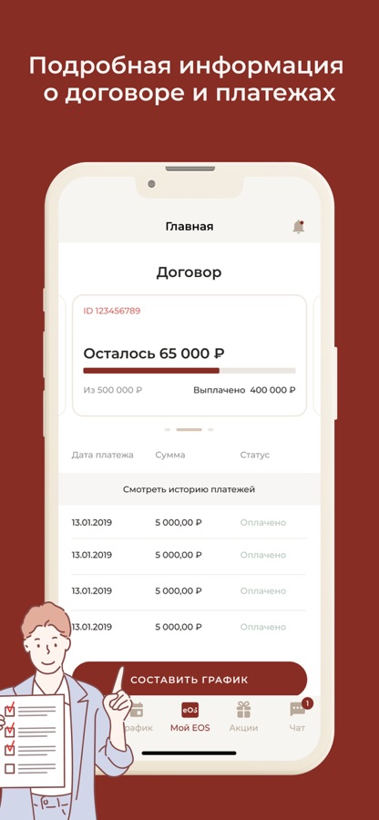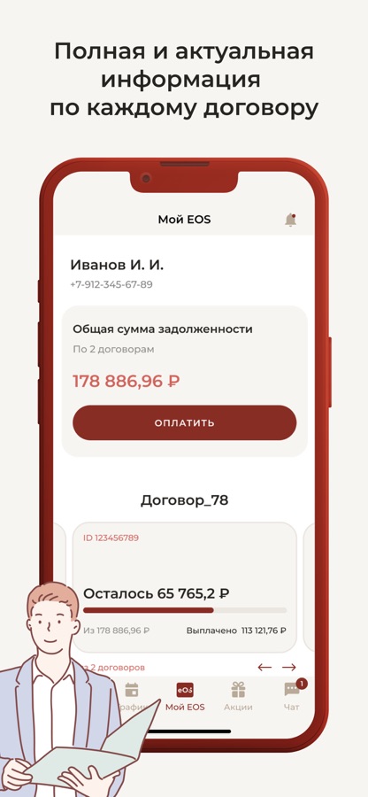 Официальное приложение ООО ПКО «ЭОС» (EOS) позволяет управлять задолженностью: совершать онлайн платежи без комиссии, узнать адреса, где можно внести оплату наличными, скачать квитанцию, всегда видеть актуальный баланс и специальные предложения. Например, получать 30% от суммы платежа бонусами для ускоренного
