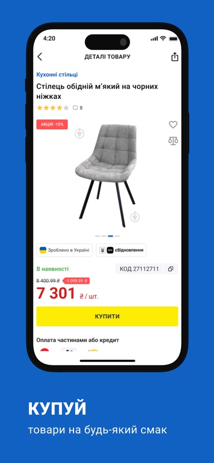 У застосунку ЕпіцентрК легко купувати у режимі 24/7, не виходячи з дому, офісу, автомобіля чи громадського транспорту. Ви можете обрати потрібний товар в каталозі, скориставшись фільтром та сортуванням. Оформлення покупки займе декілька секунд. З додатком вам не доведеться кожного разу вводити контактні дані. Потрібно лише вибрати зручний спосіб оплати і доставки. До речі, оплатити покупку можна при отриманні, карткою на сайті або через платіжну систему Apple Pay.