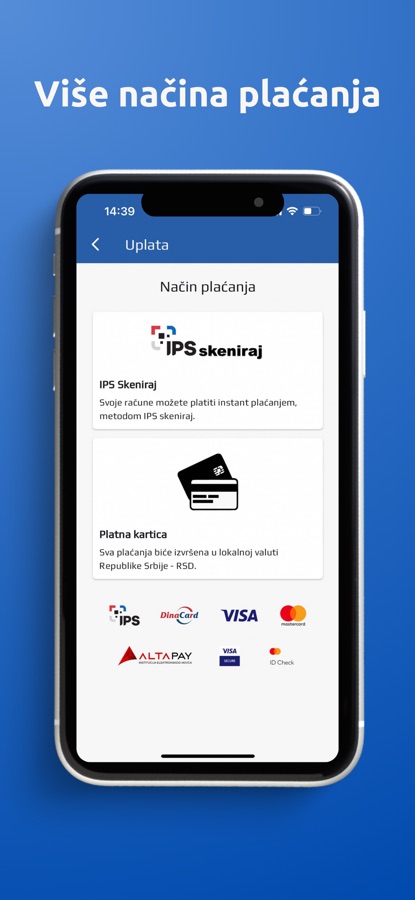 Mobilnom aplikacijom je dostupno bezbedno i brzo elektronsko plaćanje računa bez odlaska u poslovnice platnih institucija. Računi se mogu plaćati sistemom za instant plaćanja IPS Skeniraj i platnim karticama Dina, Visa i MasterCard.