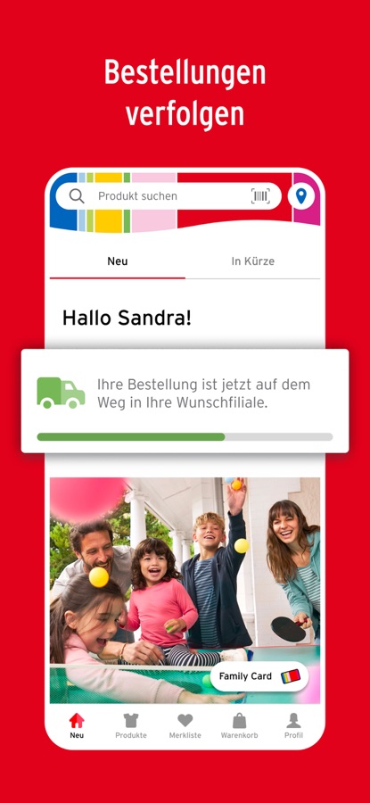 Ob in der Filiale oder online — in der App haben Sie Ihre digitale Family Card jederzeit griffbereit. Und für noch schnelleren Zugriff an der Kasse, können Sie die Family Card auch über den Startbildschirm Ihres Smartphones aufrufen.