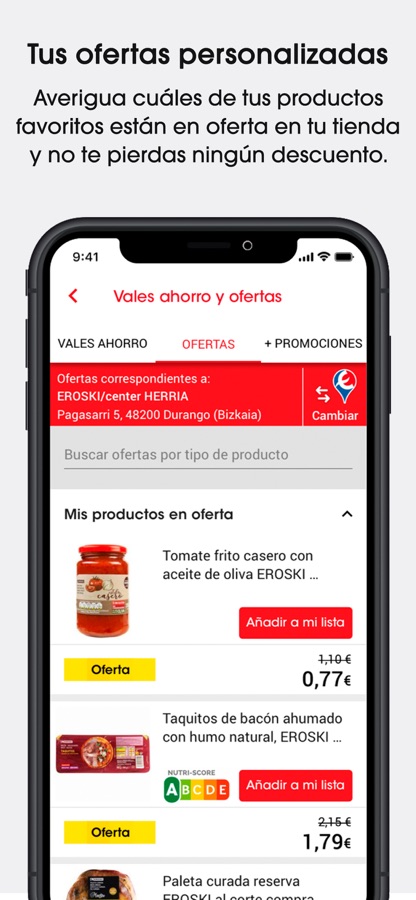Consigue tus vales ahorro personalizados en función de tu compra habitual. Actívalos fácilmente desde la App y prueba a canjear cupones descuento al comprar con tu tarjeta EROSKI club. Almacena todos tus cupones digitales en una sola App. La compra fácil y rápida en la palma de tu mano.