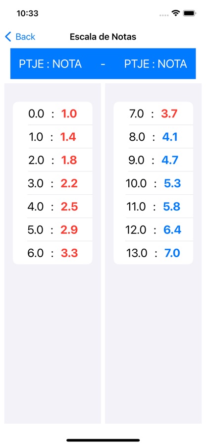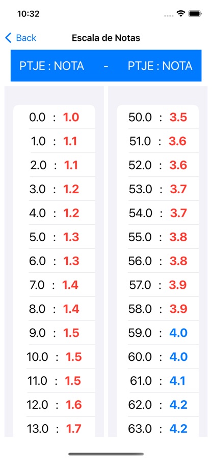 Resultados claros: Visualiza la escala en un formato de dos columnas, con notas aprobatorias en azul y reprobatorias en rojo.