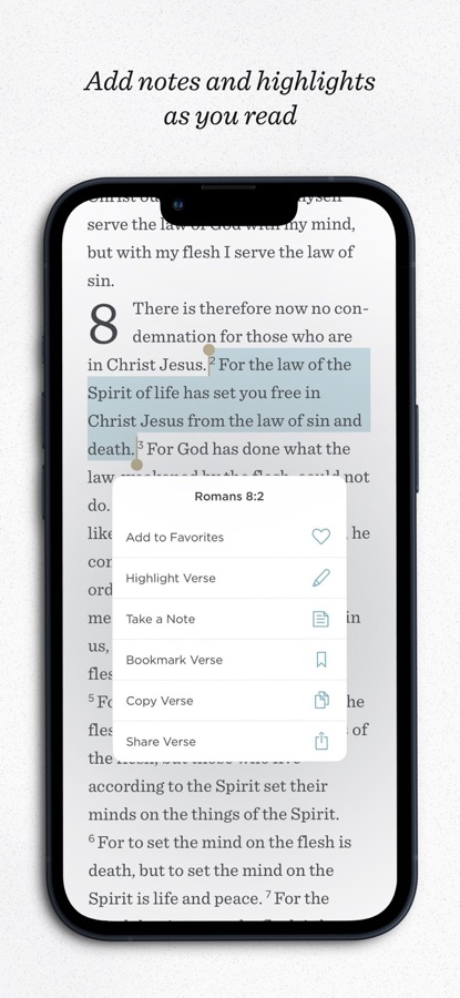 • Highlight and bookmark favorite portions of Scripture
