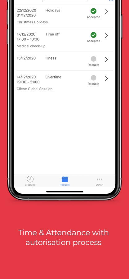 Ваши сотрудники с помощью приложения смогут запросто регистрировать начало и окончание рабочего дня, направлять запросы на отпуск, отгул и удаленную работу.