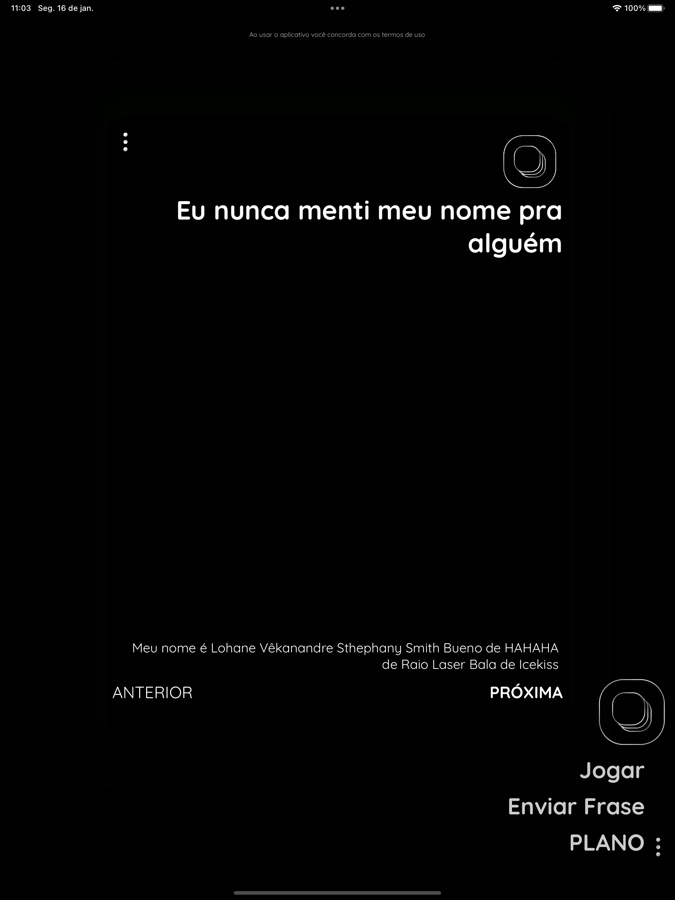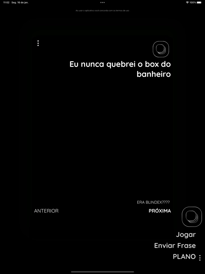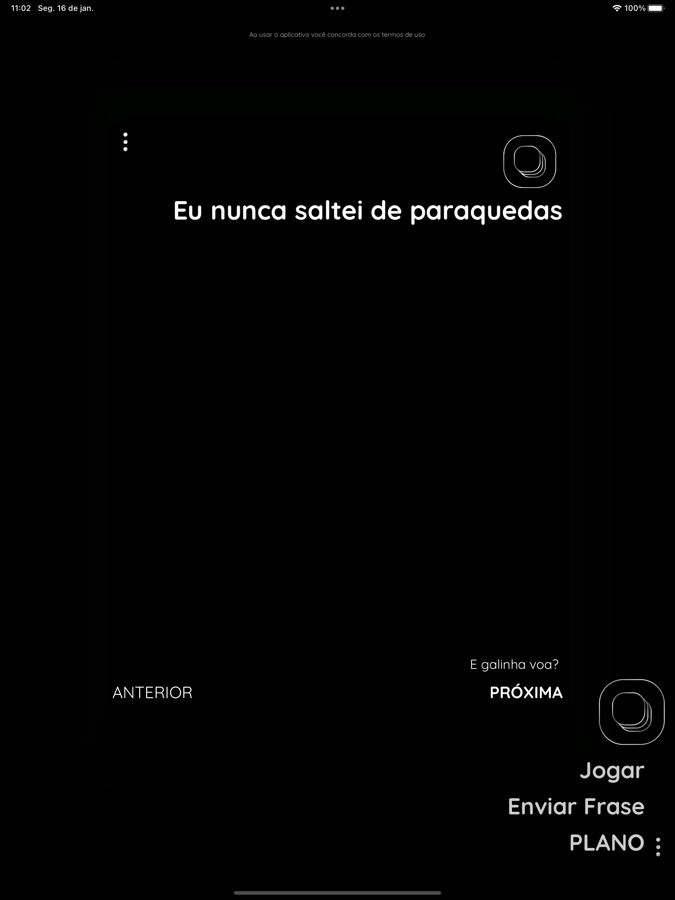 COMO JOGAR: Depois de escolher seu modo de jogo, você deverá lê as frases que aparecerem na tela para todos. Então, perde aquele que já fez o que estiver escrito.
