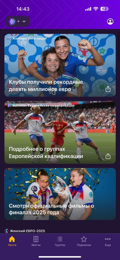 — Пересматривай лучшие моменты прошлых турниров — ЕВРО-2025 в Швейцарии и ЕВРО-2022 в Англии. Будь в курсе событий Европейской квалификации женского ЧМ-2027 и других матчей.