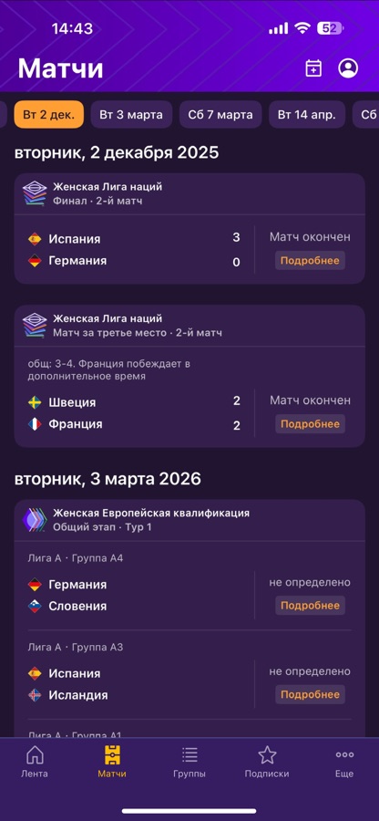 Следи за европейским футболом среди сборных в официальном приложении! Это твой путеводитель по Лиге наций УЕФА, Европейской квалификации ЧМ-2026, женской Лиге наций УЕФА и квалификации ЧМ-2027, а также на пути к ЕВРО-2028!