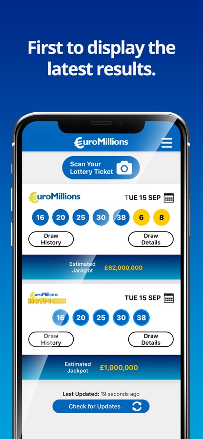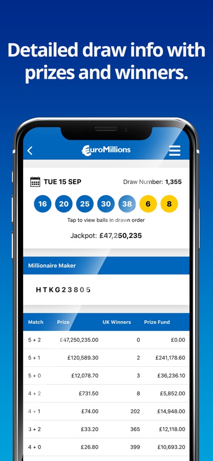 Get the latest EuroMillions results within seconds of the draws taking place. This easy-to-use app shows the National Lottery numbers, prize breakdown information and jackpots for EuroMillions (including UK and European Millionaire Maker).