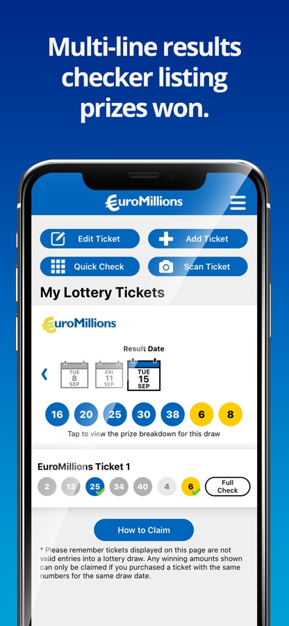 Enter and save your chosen numbers to see if you have won or to see how often they have come up in the past. You can also label your tickets – great if you play multiple lines or if you run a syndicate. The ticket checker also highlights prizes won on each ticket. Only play EuroMillions on certain days of the week? Not a problem, you can exclude your checked tickets from draws you do not play.