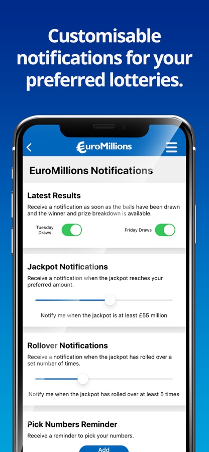Get notified instantly when the latest EuroMillions results and prize breakdowns become available. The App allows you to customise notifications so you can also choose which days of the week you play. Want to know when the jackpot has rolled over or has reached a certain amount? Just head to the Notification section of the app to set up your alerts. There is also the option to set notifications at times that suit you — great for reminding you to purchase tickets before the draw.