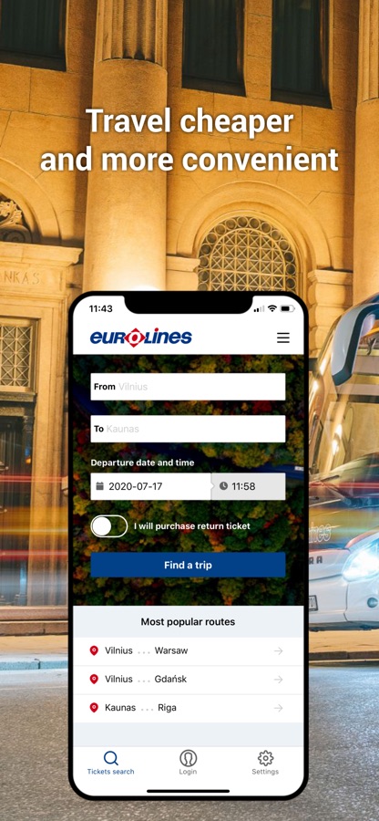 Purchase bus tickets using “Eurolines” app and rest assured that you will never lose them or leave them at home. Your tickets will always be with you on your mobile device. Also you will not need to print out the ticket – simply open it on your mobile device and show to the bus driver when boarding the bus.