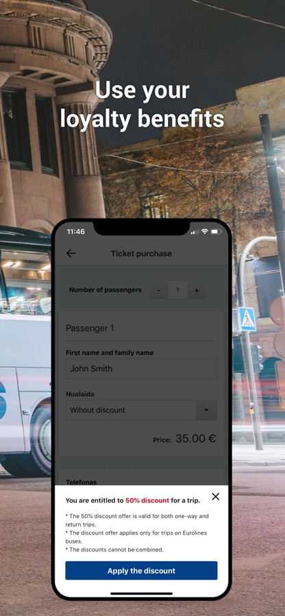 Travel with „Eurolines“ and save money with our loyalty program! Purchase three tickets and get the fourth ticket at half price! All you need to do is purchase 3 tickets for international trips on „Eurolines app.