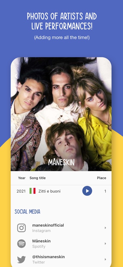 Оцените все конкурсы песни «Евровидение» вместе с друзьями и семьей! Реакции смайликов в реальном времени, и вы создаете комбинированную систему показателей, которой можете поделиться в социальных сетях!