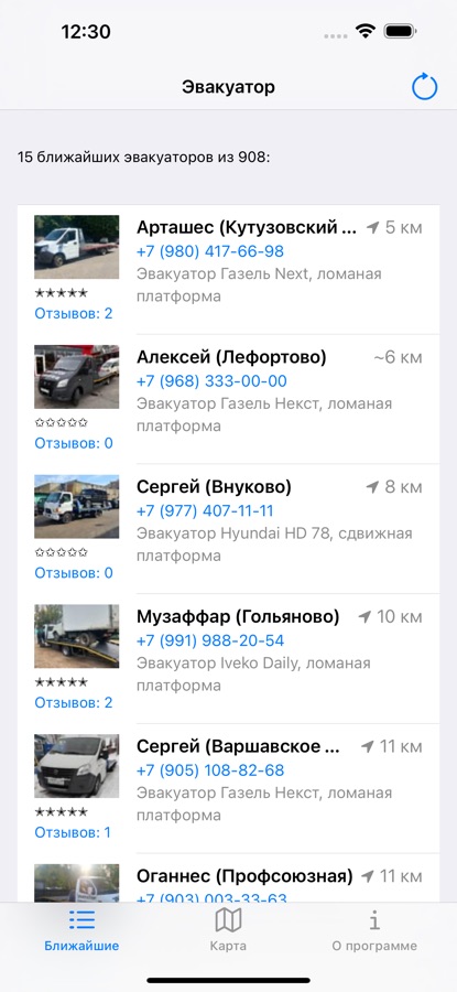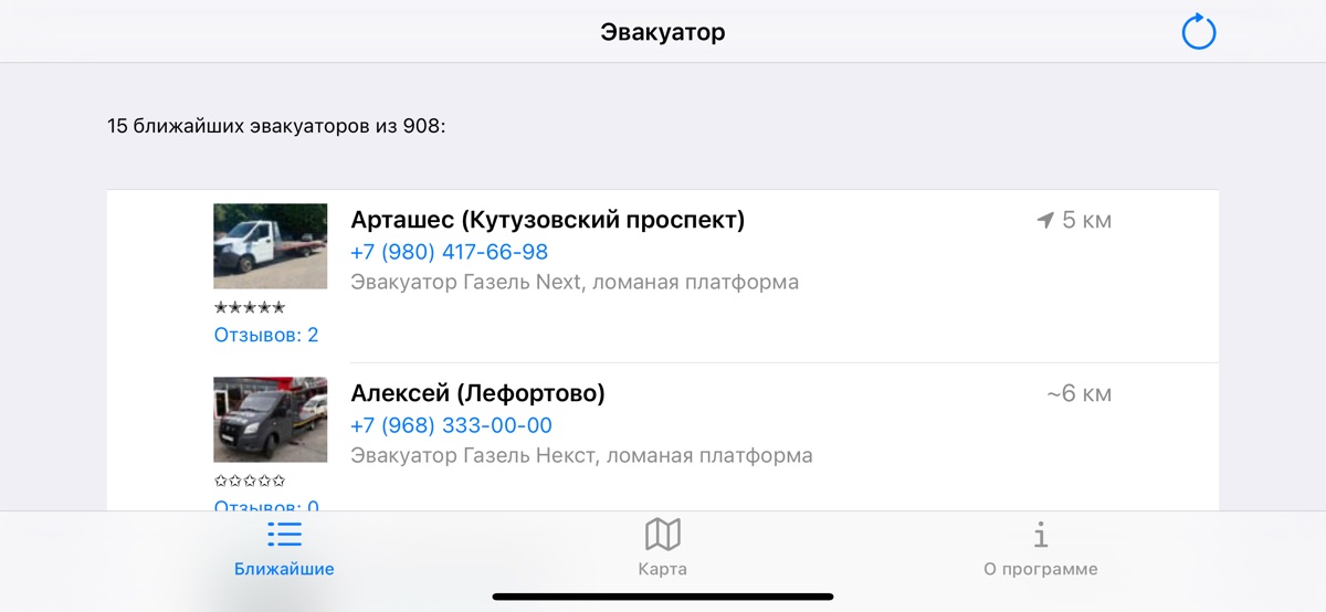 Телефоны и реальное расстояние до 15 ближайших эвакуаторов. Местоположение получается с сайта www.evakuator-mos.ru. Если эвакуатор передает местоположение, то Вы видите точное расстояние до него, иначе показывается примерное («~») расстояние до его стоянки.