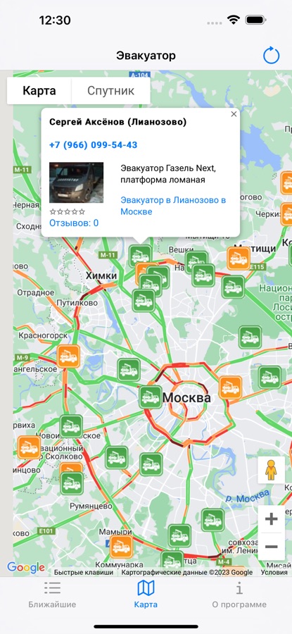 Приложение показывает прямой номер телефона и имя водителя, марку, модель, описание и фотографию эвакуатора, а также отзывы клиентов.