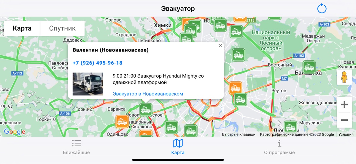 3. Приложение работает по всему миру, даже если в списке нет эвакуатора рядом, на вкладке Карта вы его найдете.