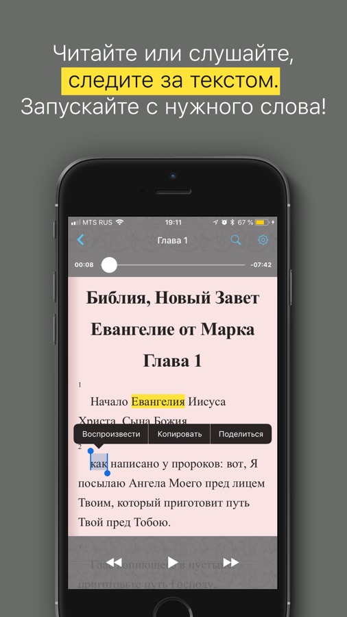 ・Воспроизведение с выбранного слова при помощи долгого касания;