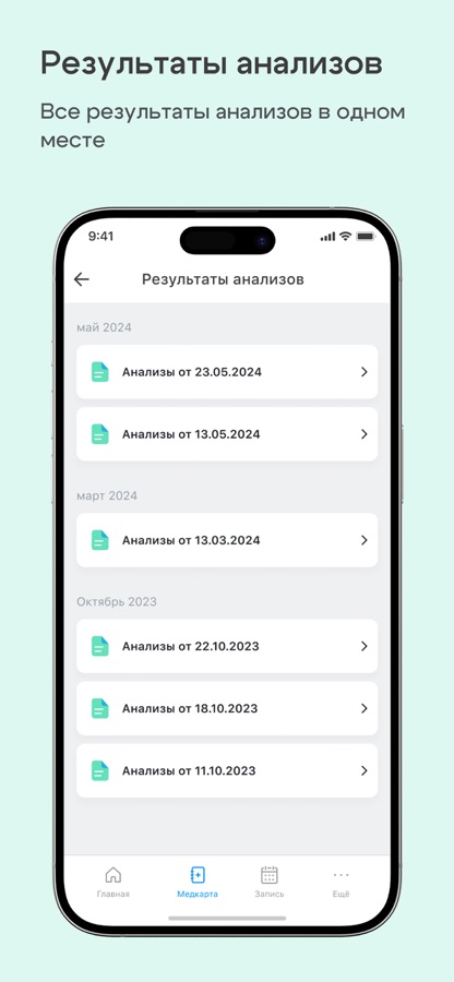 Электронная медицинская карта с результатами анализов и данными о приемах.