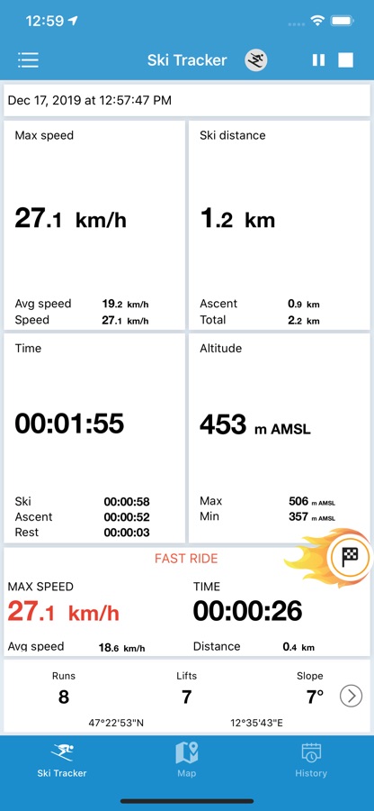 Ski Tracker Oтслеживание лыжи, это приложение для всех, кто любит снег и зимние виды спорта. Полезно для лыжников и сноубордистов. Измерьте максимальную скорость на лыжах, дорожки, расстояние, отметьте склоны на карте и обеспечить полную статистику вашей зимней спортивной деятельности.