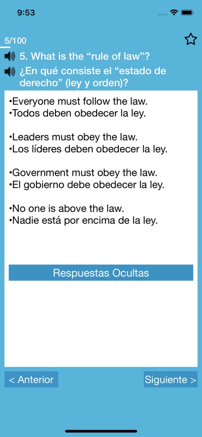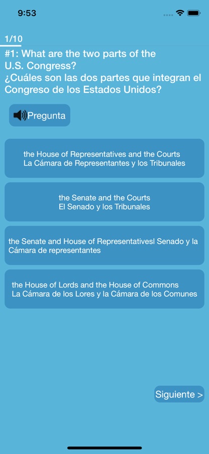 Esta aplicación le ayudará a estudiar para el examen de ciudadanía de los Estados Unidos. Con esta prueba de práctica gratuita para la ciudadanía estadounidense, podrá prepararse para la entrevista final de ciudadanía. Para convertirse en ciudadano de los Estados Unidos, debe responder correctamente al menos 12 de las 20 preguntas (versión de 128 preguntas) o 6 de las 10 preguntas (versión de 100 preguntas).