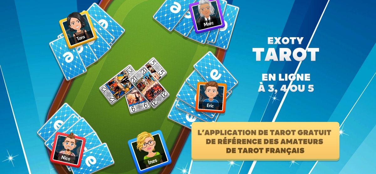 Exoty tarot, c’est l’application de tarot gratuit de référence des amateurs de tarot français et de jeux de cartes. Il s’agit du meilleur de tarot en ligne gratuit dédié à la compétition du fameux jeu de cartes !