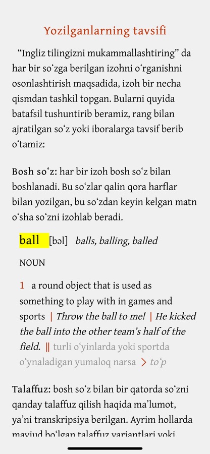 Bu kitobchalar to’plami ingliz tilida ko’p ishlatiladigan so’zlarni o’zbeklar chuqurroq tushuna olishlariga yordam bera oladigan asbob bo’lib xizmat qiladi. Bu so’zlar ingliz tilida kengaytirilgan maʼnolarda ishlatiladi va tez-tez idiomatik iboralarda uchrab turadigan, odatdagi va doimiy so’zlardir. “Ingliz tilingizni mukammallashtiring” kitobchalar to’plami — tilni o’rgatadigan asbob bo’lib, bu odatdagi lug’atdan keskin farq qiladi. Foydalanuvchilar ko’pincha tarjima muqobillari yoki o’zbekcha so’zlar berilmaganligini sezishlari mumkin. Ammo har bir ibora yoki gapda so’zlarning aniq maʼnolari keltirilgan. Bu maʼnolar ingliz tilida yozilgan va o’zbekchaga ham tarjima qilingan.