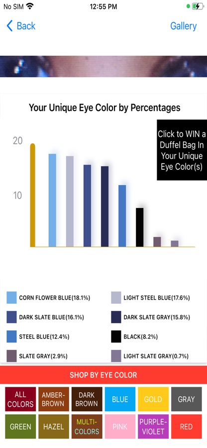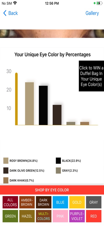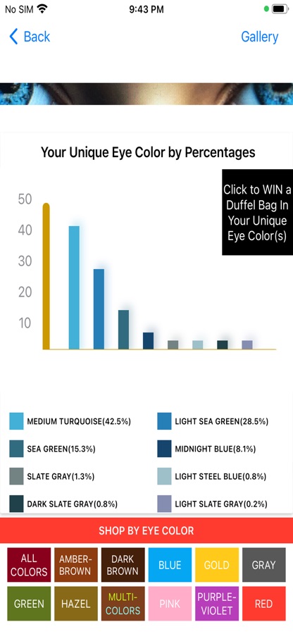 Discover, measure and share your unique and iconic eye color(s) and shade(s) with free eye color analyzer and detector app, and then go shopping by eye colors and shades. How about the eye color of a family member, significant other, friend or as a party event! Simply locate natural lighting and snap a picture of your eyes with any Apple device. Immediately see the percentages of each color or shade in your eyes. How brown are your eyes and are there different shades of brown? What proportion of each eye shade or color is there?