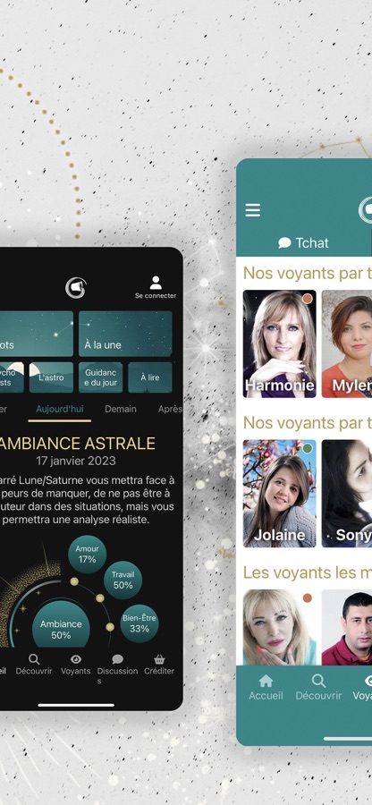 L’application Numéro Un pour vos horoscopes gratuits du jour, de la semaine, du mois et de vos weekends. Retrouvez dans votre application : votre astrologie, des tirages de Tarots et les consultations de voyance par téléphone.