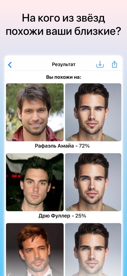 Сделайте или загрузите из галереи фотографию лица крупным планом и через пару секунд вы увидите результат: 3 знаменитости, на которых вы похожи. С каждой знаменитостью вы увидите процент сходства.