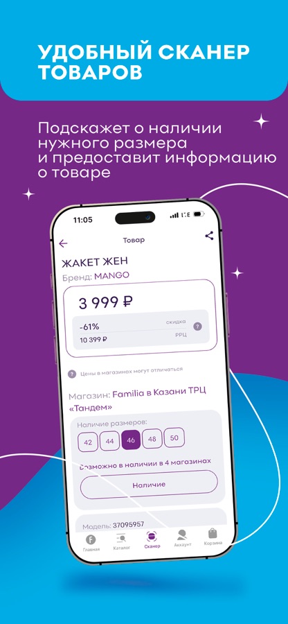 Сканер товара в приложении поможет получить информацию о наличии нужного размера. Достаточно отсканировать этикетку, выбрать интересующий магазин и на экране появится карточка товара.