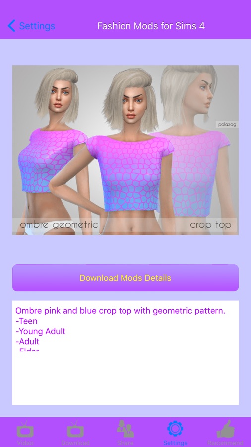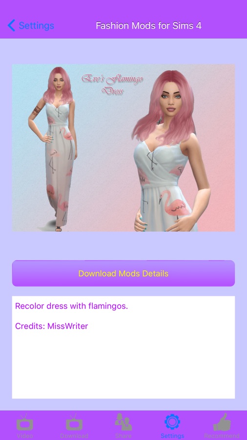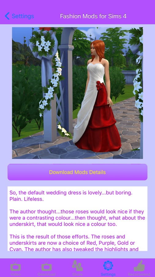 This app contains attractive Fashion Mods of 【Sims 4】 on PC, and all the mods can be downloaded from our server after purchasing the In-App Purchase Mods ticket, which enable you to download ALL current mods in the app without further charge or periodic subscription. With the Mods screenshots and descriptions, you will be able to find out whether the time and money needed is worth to backup the game, download and install the Mods.