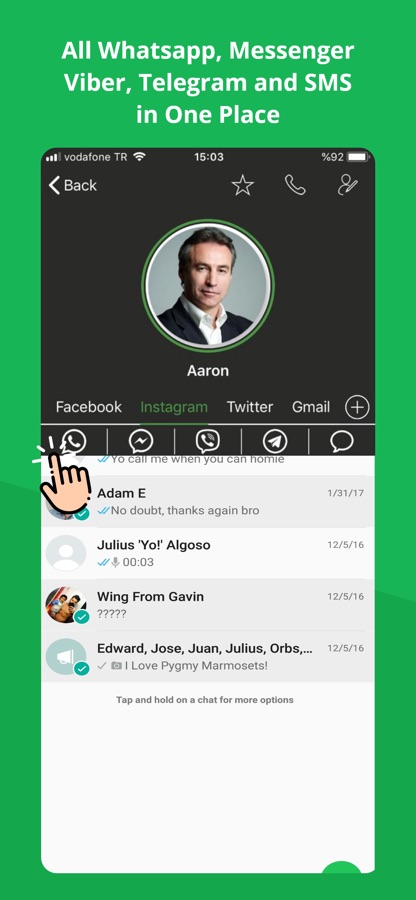 Выберите человека из списка контактов и просматривайте его сообщения в Instagram, Facebook, Messenger, Twitter, WhatsApp, Viber и других сообщениях в одном месте.