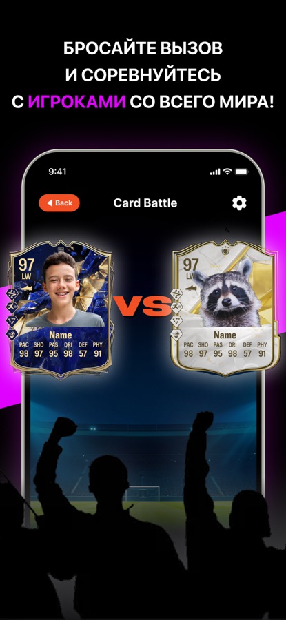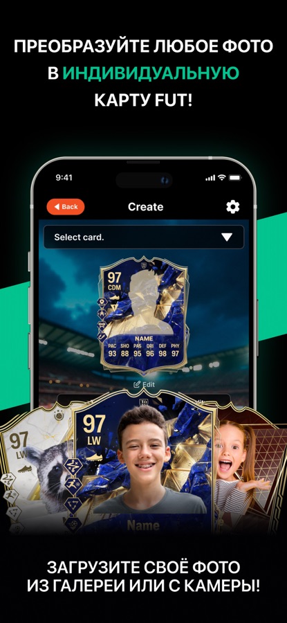 Создавайте FUT-карточки за минуты: фото, имя, статы, позиция. Собирайте составы, пробуйте схемы и тактики и делитесь командой мечты.