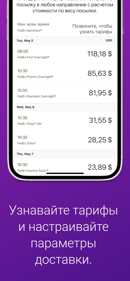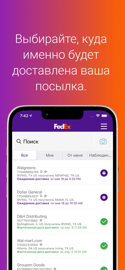 Загрузите приложение для более удобной отправки и отслеживания посылок. Управляйте своими отправлениями FedEx в приложении FedEx Mobile. Оно очень удобное и совместимо даже со смарт-часами.