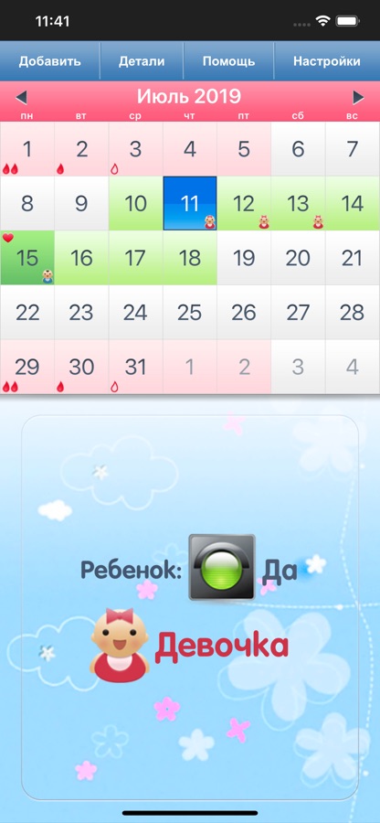 Просто введите первый день последней менструации, и приложение спрогнозирует следующую менструацию, день овуляции, а также наиболее и наименее благоприятные дни цикла.