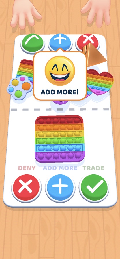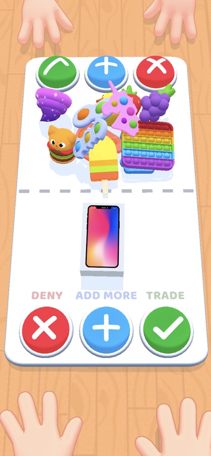Простая и увлекательная механика. У тебя только три варианта: принять, отказаться и потребовать больше игрушек. Обмен фиджетами еще никогда не был таким простым!