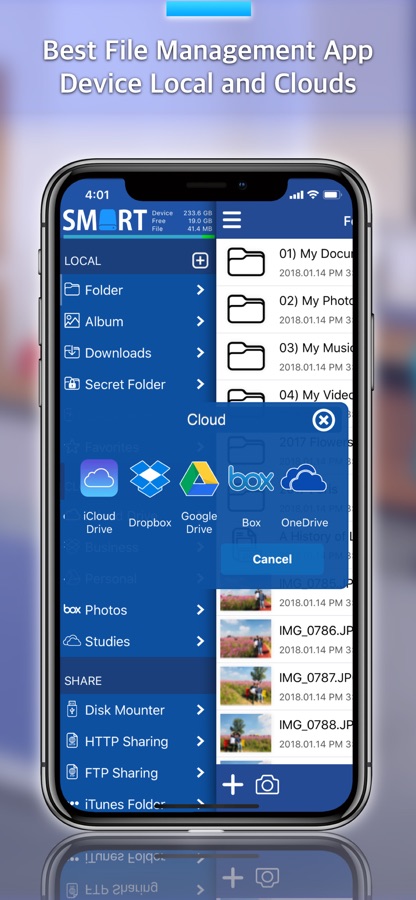You can management your device files and cloud files. Supported iCloud Drive, Dropbox, Google Drive, Box, OneDrive.