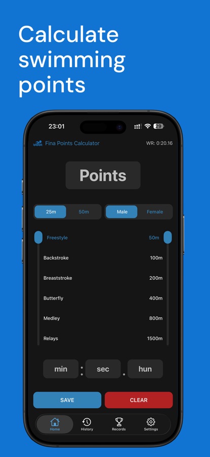 FINA Points Calculator allows you to convert your time to points and vice versa.