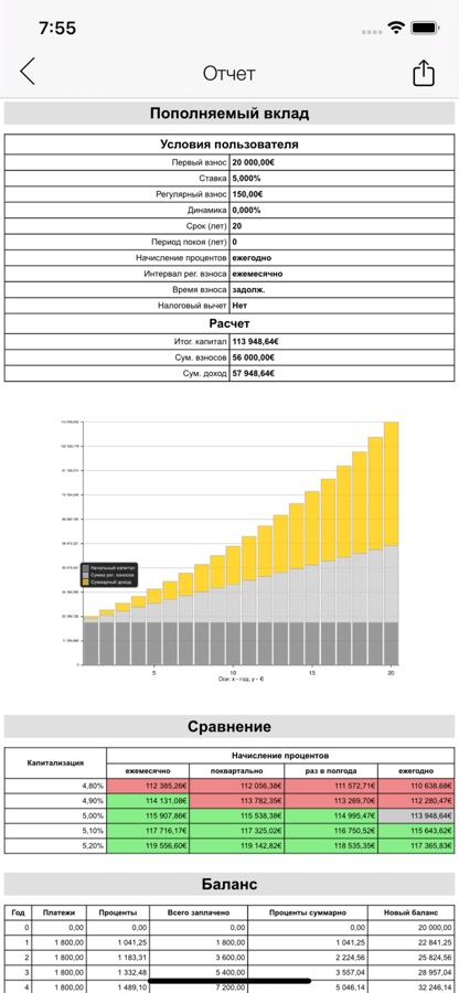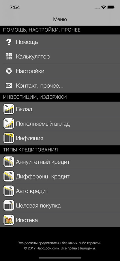 Финансовый калькулятор Про — универсальное iPhone/iPad приложение предлагающее рядовым пользователям быстрый способ расчета параметров кредитования и оценки производительности по вкладам не прибегая к помощи банковских специалистов. Программа также предоставляет детальный отчет выполненных расчетов в графической и табличой формах, который может быть распечатан или отослан по электронной почте для дальнейшей обработки.