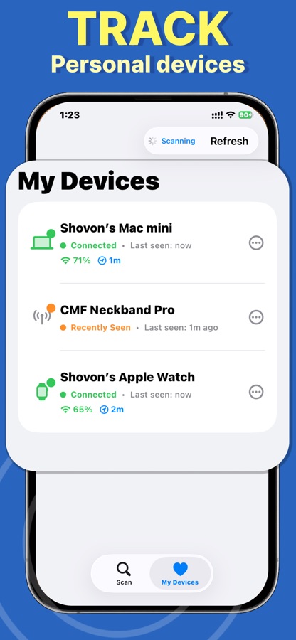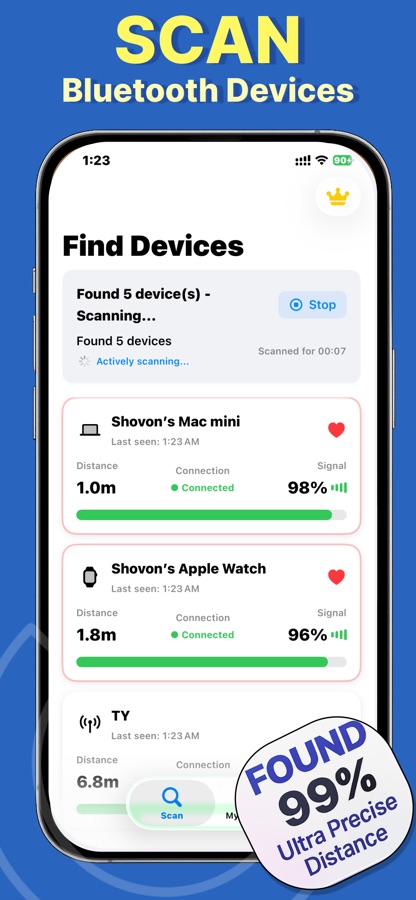 See all Bluetooth (BLE) devices around you at a glance. Refresh scans, sort, favorite known devices, and jump back to them later.