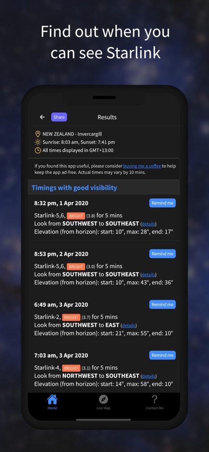 Designed to be simple and easy to use. First, please select your nearest city (or coordinates), and click on ‘Find Visible Times’. The app will list the times when you can see Starlink. You can also click ‘Remind me’ next to any timing, to get a reminder 30 minutes before Starlink will be visible at your location. A ‘Live Map’ lets you track where Starlink is currently in the world.