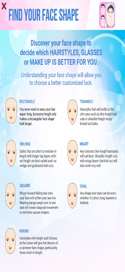 Основными особенностями этого приложения являются советы по укладке волос для женщин разных форм лица, чтобы сделать вашу форму лица прозрачной, в зависимости от ее формы, сбалансированной и пропорциональной.