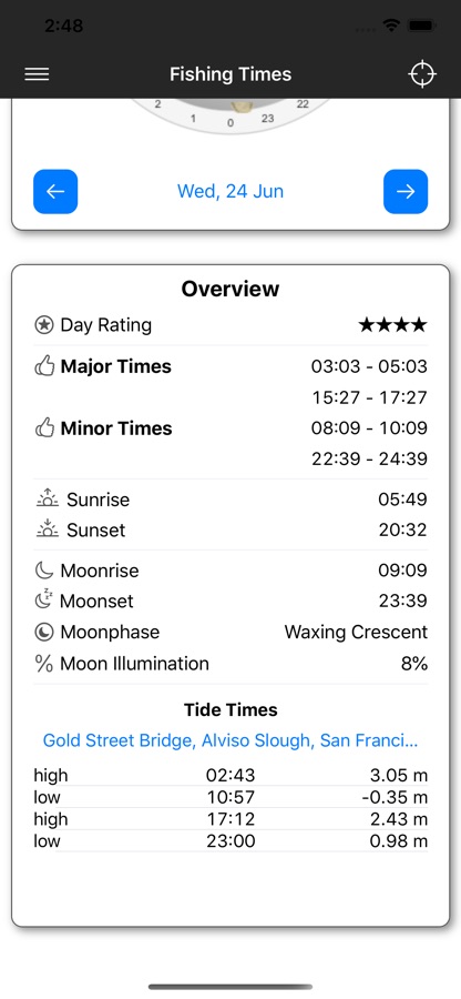 We’re using a unique Solunar Clock graphic to display our fishing times. It’s a 24 hour clock with indicators for fishing times, sun and moon times, moon phase, tide times (if available for your location).