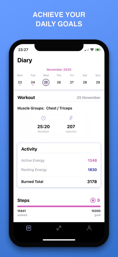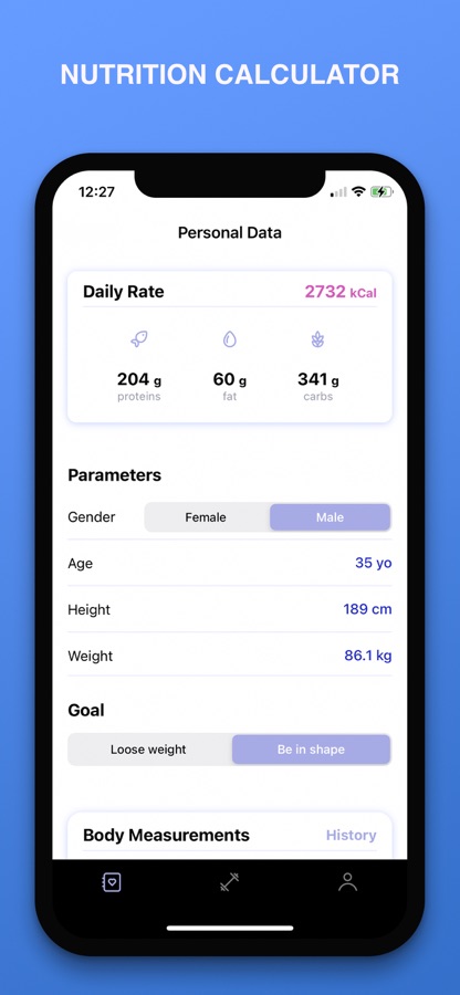 С нами ты каждый день будешь ещё на один шаг ближе к своей цели — красивому телу. Контролируй потребление и расход калорий, отслеживай дневную норму шагов и потребления воды, отмечай прогресс при помощи замеров и фото до/после. Получай свой расчет КБЖУ, исходя из поставленных целей.