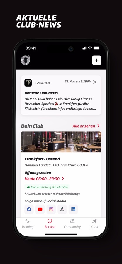 — All relevant information on all clubs: opening hours, address, live capacity utilization & social media links.