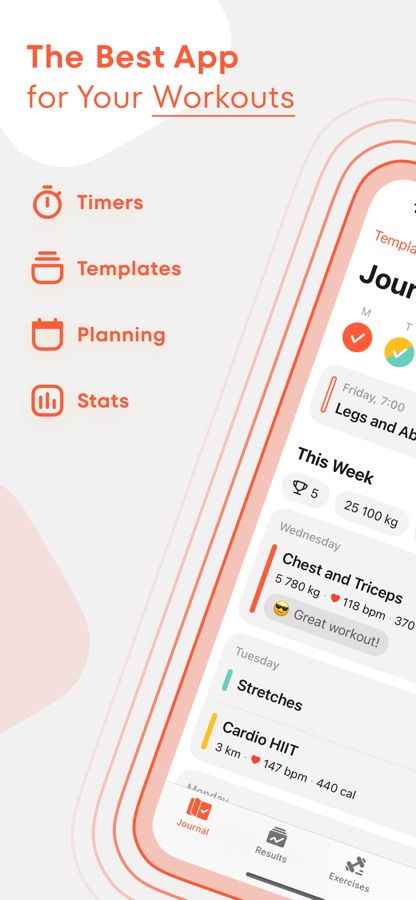 • Раздел Результаты с интерактивными виджетами, где вы сможете удобно отслеживать статистику и историю тренировок, статистику и прогресс в любых упражнениях по вашему выбору, вести вес, замеры тела и добавлять свои фото прогресса