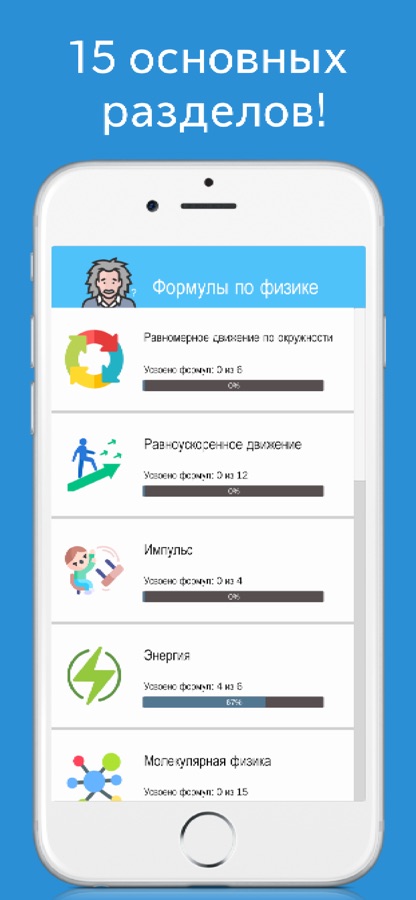 Привет, дорогой друг! Все очень просто – абсолютно все формулы по физике разбиты на 15 разделов, выбери нужный, изучи формулы и пройди короткий итоговый тест по всему разделу!