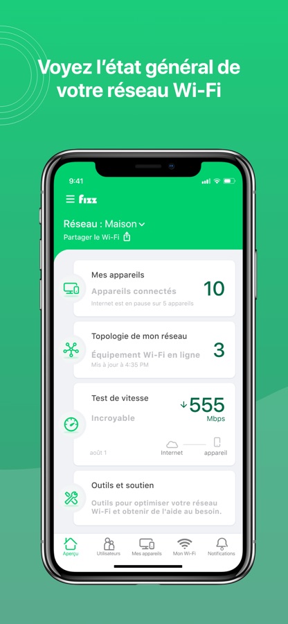 Appli pour gérer votre service Internet résidentiel Fizz et avoir votre réseau Wi-Fi à portée de main, que vous soyez chez vous ou non. Voyez les détails importants comme les appareils connectés et les alertes de dépannage. Diagnostiquez et optimisez facilement votre réseau Wi-Fi, directement à partir de votre appareil intelligent.